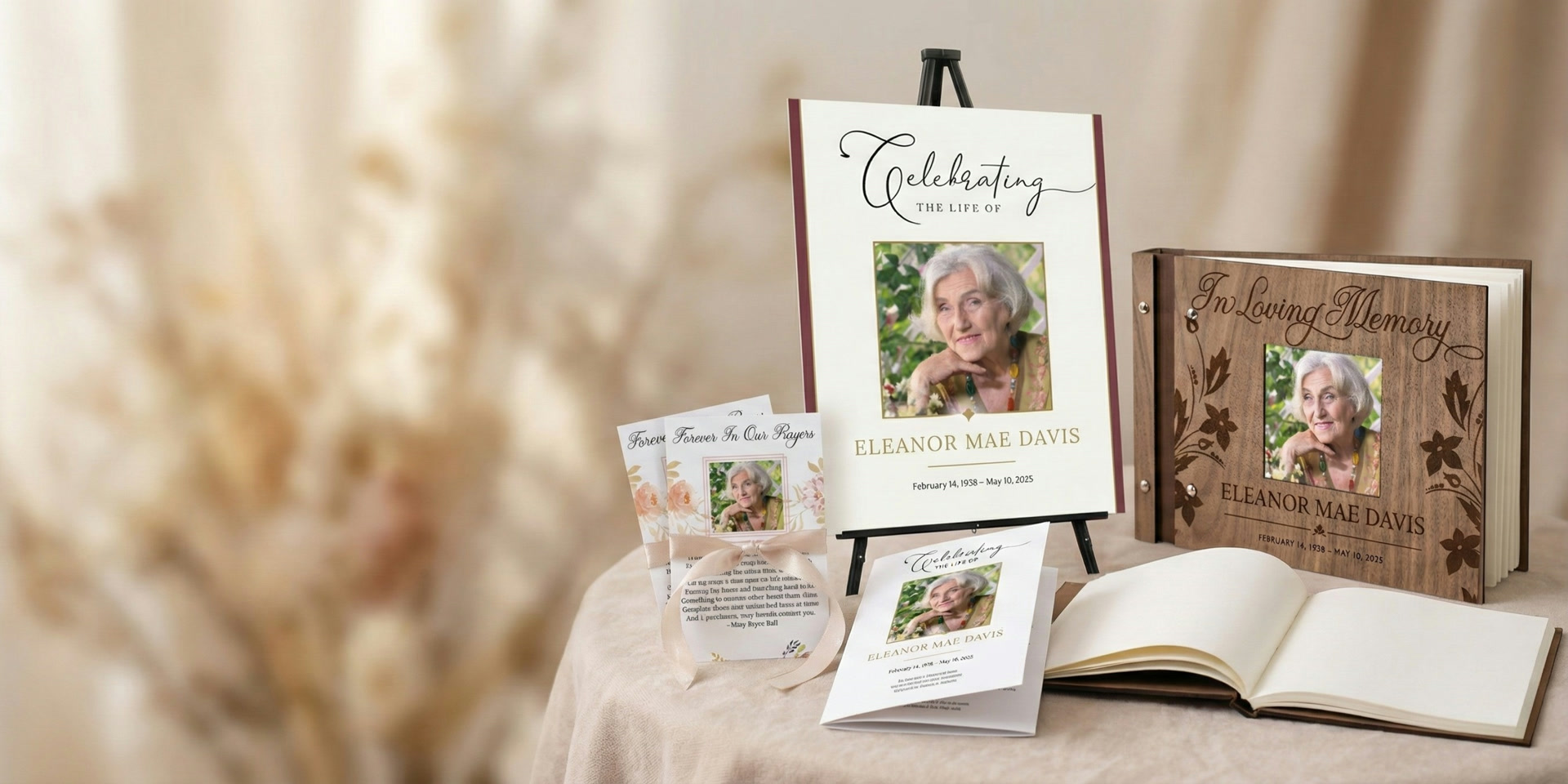 Whether you need personalized prayer cards for attendees or guest books for celebration of life services, our intuitive online customizer lets you create beautiful tributes in minutes with live preview.